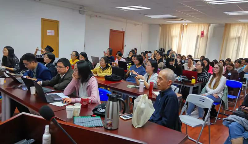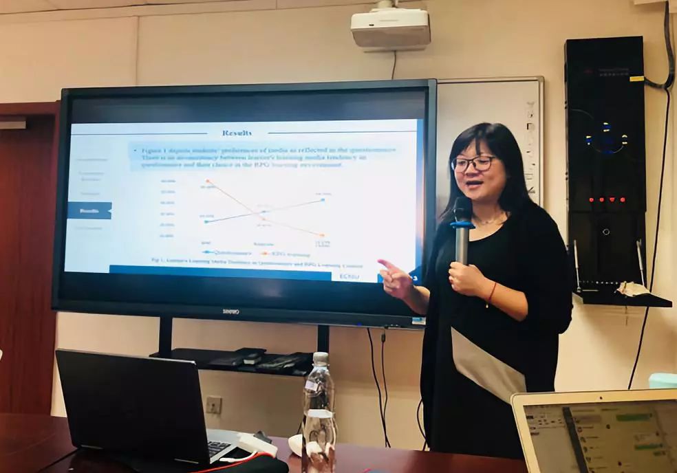 第二位汇报的老师是冷静老师,冷老师的汇报的内容是“Increasing the Effectiveness of English Vocabulary Learning: The Effects ofMedia on Students’ Cognitive Load andLearning Outcome”。冷老师基于前人关于哪一种媒体形式更有效的研究,通过RPG这款游戏软件开发背单词的教育游戏,将30名被试分为两组选择不同的学习方式从而测量媒体形式对学生的认知负荷及学习效果的影响。该研究不仅测量了不同媒体在哪一种情境下最有效,还测量了哪一种媒体给学生带来的认知负荷是最少。研究中一组被试可以自由选择媒体形式,另一组被试只能看video形式的资料。其中值得注意的研究数据显示,学生问卷当中倾向的媒体类型与实际情境中倾向的媒体是不一样的。在认知负荷层面,具有动画的视频形式相比文字会给学生带来更多的认知负荷并在一定程度上分散了学生的注意力。而文字形式的媒体相对来说比较聚焦,可以在更短的时间内让学生完成学习内容。在学习的有效性层面,相对复杂的信息材料适合以视频或动画的形式呈现,学生的学习效果会更好。冷老师的研究结论表明,进行教学设计时,设计者必须要全面的考虑学生的认知水平及学习风格,不能设计单一形式的学习媒体,而是要学生提供合适的可以选择的媒体形式。在汇报结束后,有两三位同学与冷老师互动并表达了自己的疑问,在互动的过程中同学们对冷老师的研究更加熟悉并在做相关研究方面有了更深刻的认识。