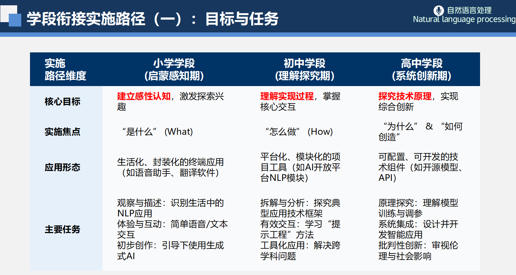 陈红桂老师以“自然语言处理在教育中的定位与实施路径”为主题,系统梳理了自然语言处理在人工智能通识教育中的支柱性地位,并结合《中小学人工智能通识教育指南(2025版)》及多省市课程纲要,构建了覆盖“智能意识、人机协同思维、智能应用与创新、智慧社会责任”四个维度的螺旋式学段目标体系。她还以“高考志愿填报智能系统”为案例,深入浅出地解析了自然语言处理从用户输入、意图理解到结果生成的全流程与核心技术架构,为各学段教学提供了清晰的理论锚点与实践参照。